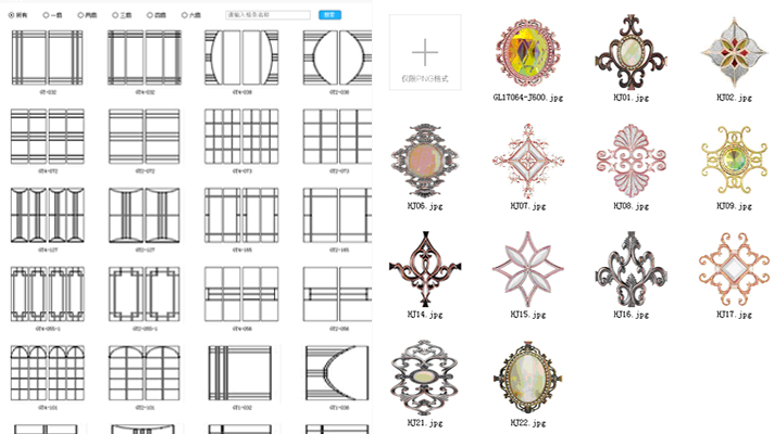 軟件自帶格條樣式,即點即用,也可自己設計格條和添加玻璃花件