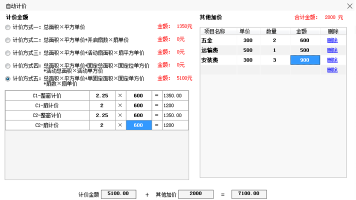 系統預設5種門店常用的報價計價方案,用戶直接選擇輸入相應的數據保存使用,設計下單時自動計算出該系列的報價